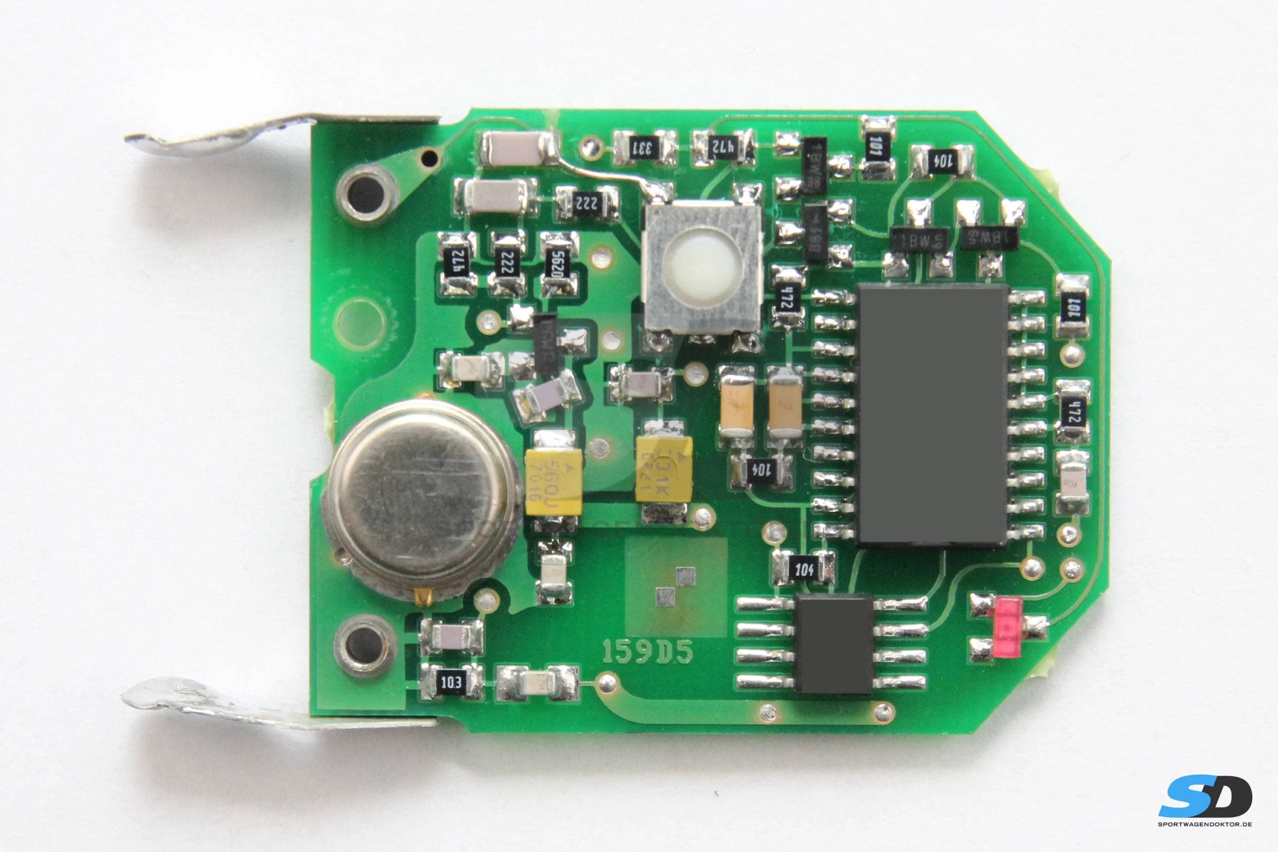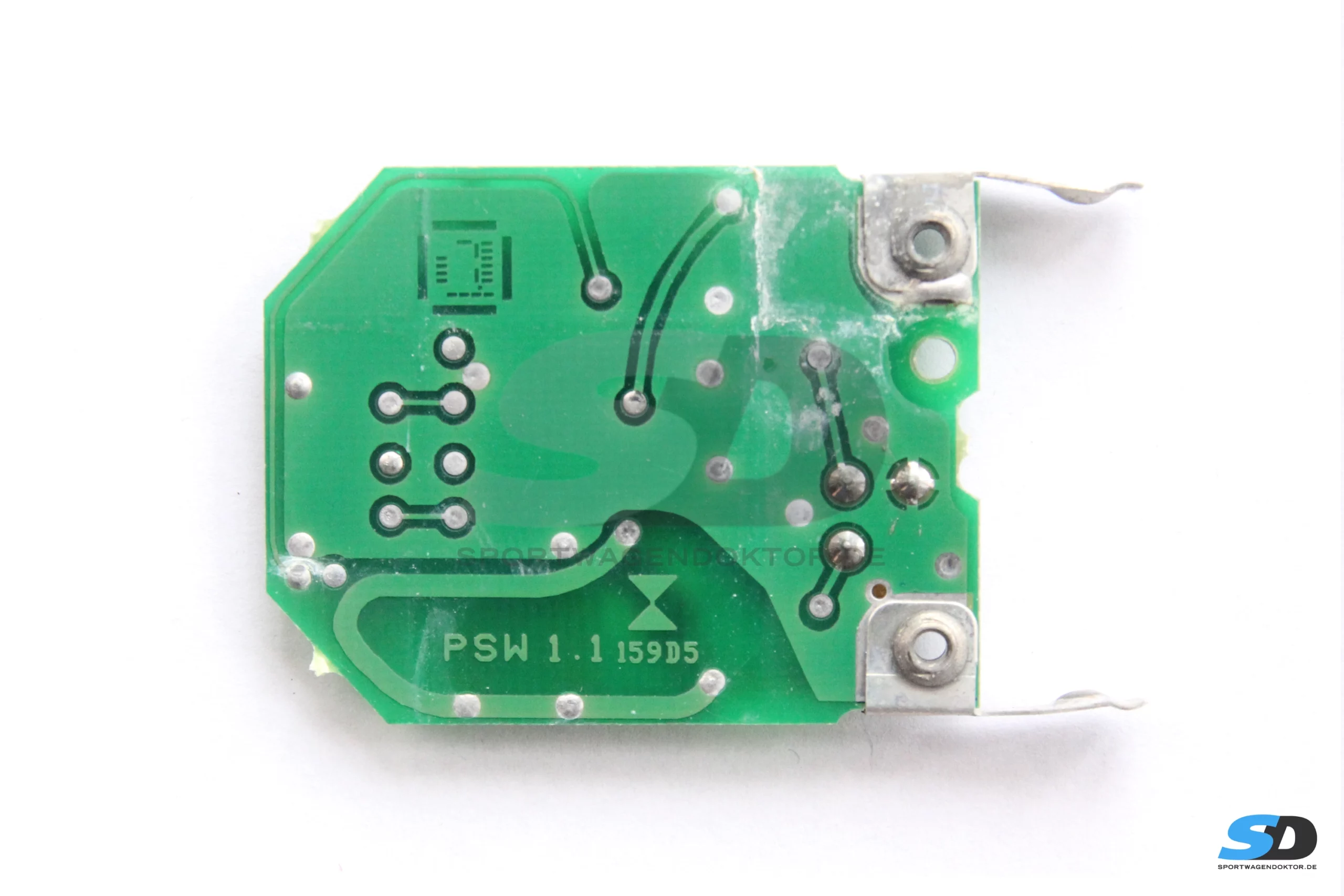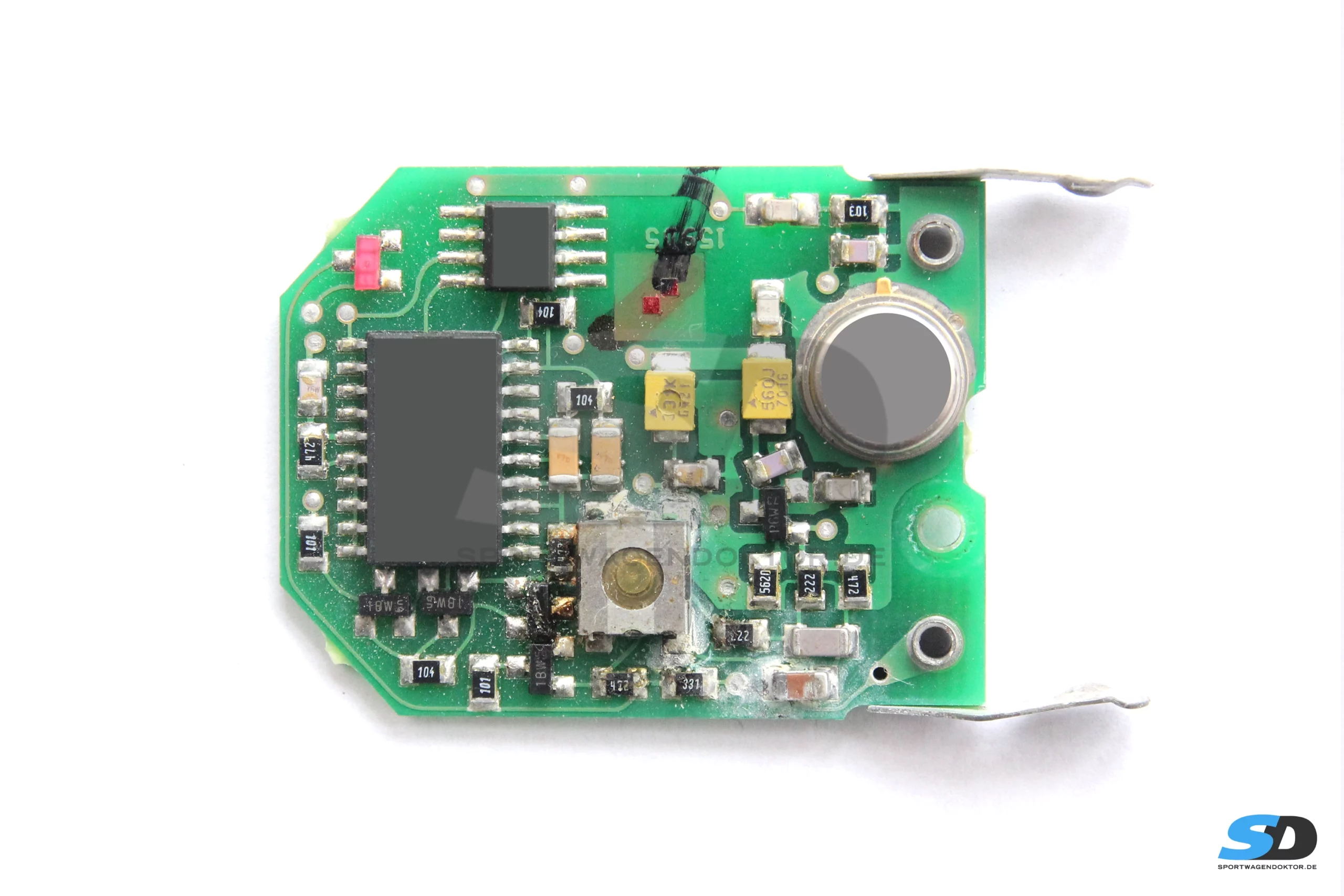Die Platine des Handsenders des Porsche 993 hatte deutliche Korrosionsspuren. Der Sender sendete bei der Eingangsmessung kein Signal. Nach Austausch einiger Bauteile, sowie des Mikrotasters und Reparatur einer durchkorrodierten Leiterbahn, sendete das Funkmodul wieder ein einwandfreies Signal und wurde auch vom Fahrzeug sofort wiedererkannt.