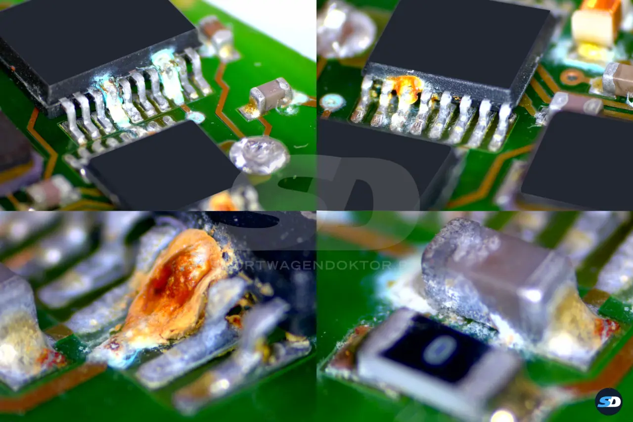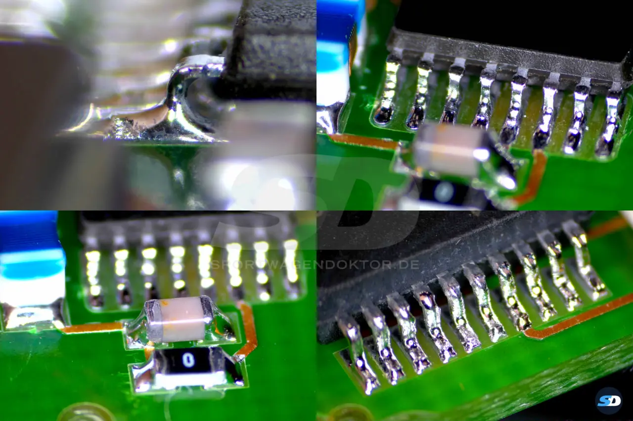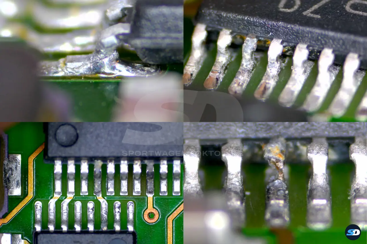 Nach dem chemischen Entfernen der Korrosion präsentieren sich die Lötstellen zusätzlich zu Lötstellenanbrüchen in sehr schlechten Zustand. Teilweise konnte ich die Korrosion nur mechanisch entfernen. Zum Teil waren Kontakte fast wegkorrodiert und Bauteile hingen halb lose auf der Platine und fielen bei geringstem mechanischem Druck ab. Einige Bauteile musste ich auch ersetzen, beispielsweise das HF-Modul.