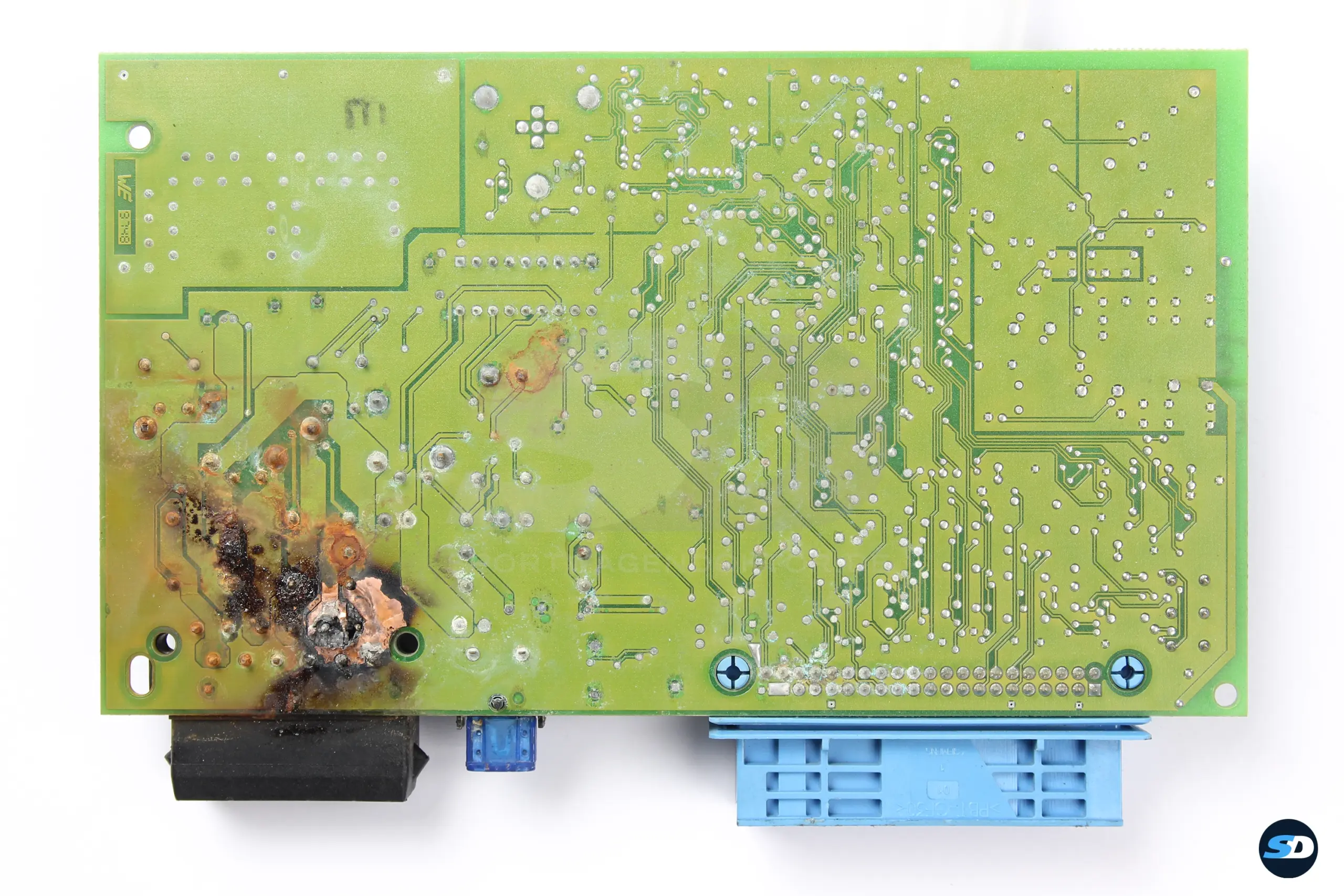 Mein Kunde sendete mir Signalwandler, Motorsteuergerät (DME), Kombiinstrument und den alten und die neuen Handsender / Schlüssel zu. Das alte Alarmsteuergerät hatte einen massiven Wasserschaden erlitten, im Bereich der Hauptstromversorgung prangte ein großes Loch in der Platine.